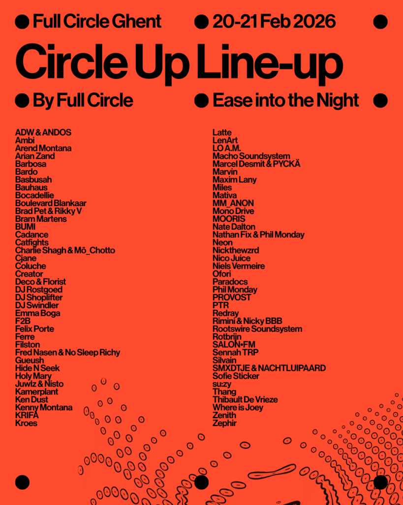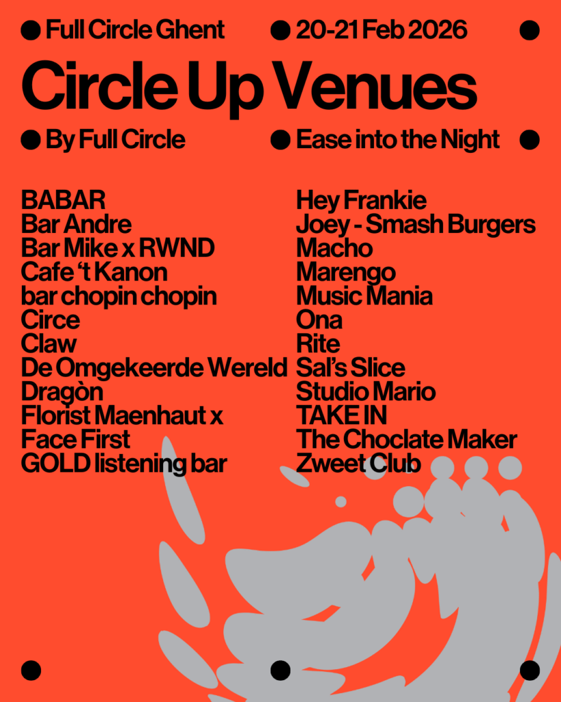 Circle Up is the official series of free warm-up events taking place across Ghent before the main Full Circle club night begins. Partnering with local spots such as eateries, bars, coffee houses, and record shops, each venue hosts its own unique pre-party, offering a distinct musical program and vibe to ease into the evening.
